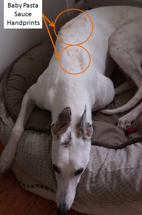 Samantha was fun this week. I made the mistake of feeding her some pasta while the dog was in the kitchen this week. Not only did she turn herself into a little Mel Gibson Braveheart wanna-be but she put pasta sauce covered hands on the dog.